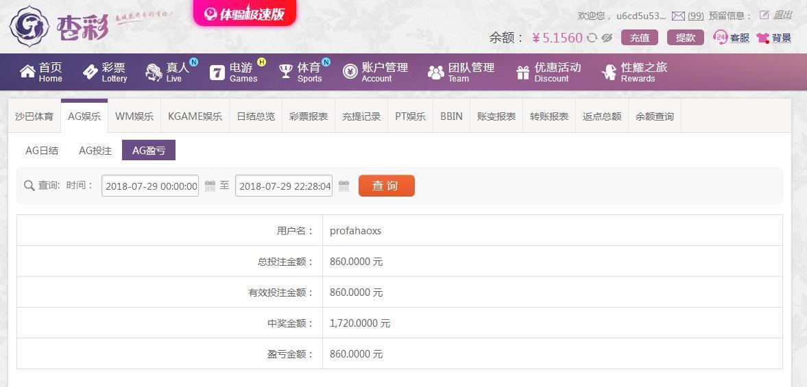 [|赢单奖励] 7月29日杏彩AG赢利860 |