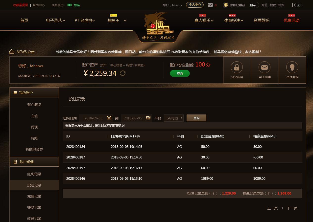 [|赢单奖励] 9月5日博马AG赢利1169 |