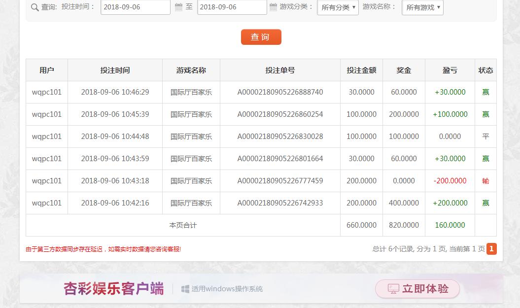 [|赢单奖励] 9月6日杏彩盈利160元 |