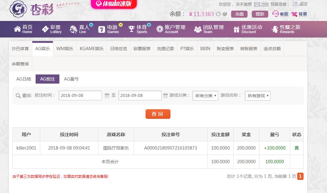 [|赢单奖励] 9月8日杏彩AG盈利100 |
