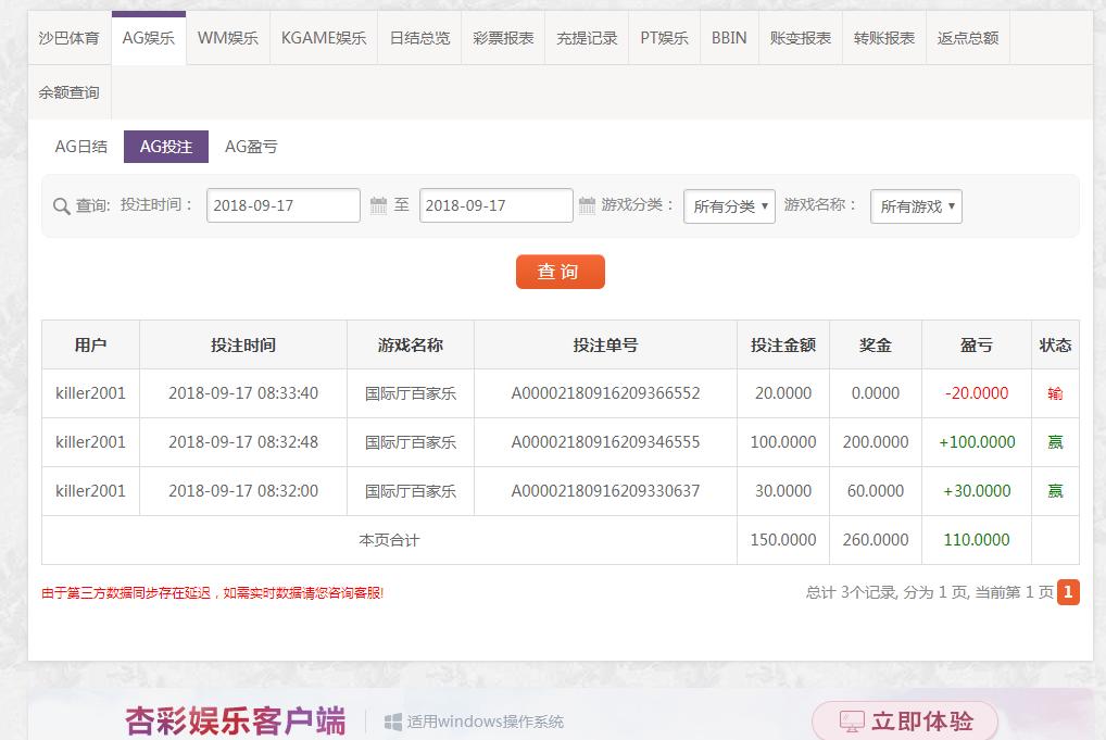 [|赢单奖励] 9月17日杏彩AG赢利110 |