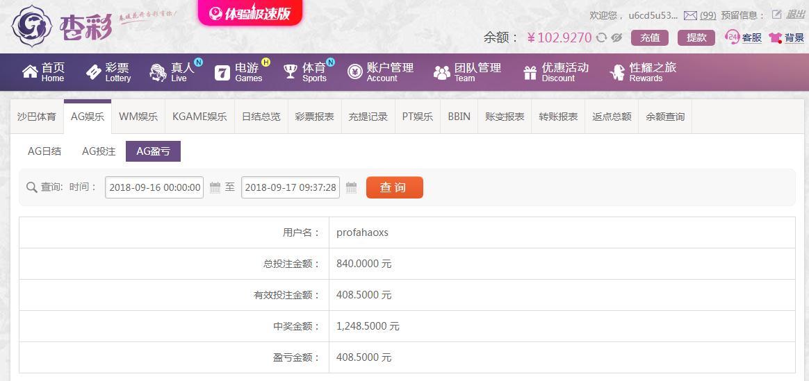 [|赢单奖励] 9月17日杏彩AG赢利408 |