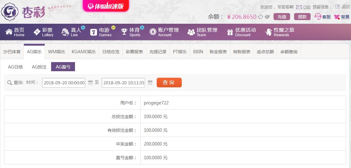 [|赢单奖励] 9月20日杏彩AG赢利100 |