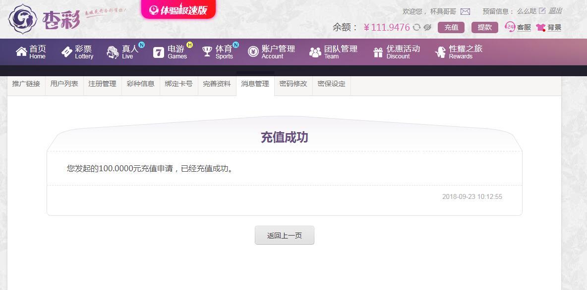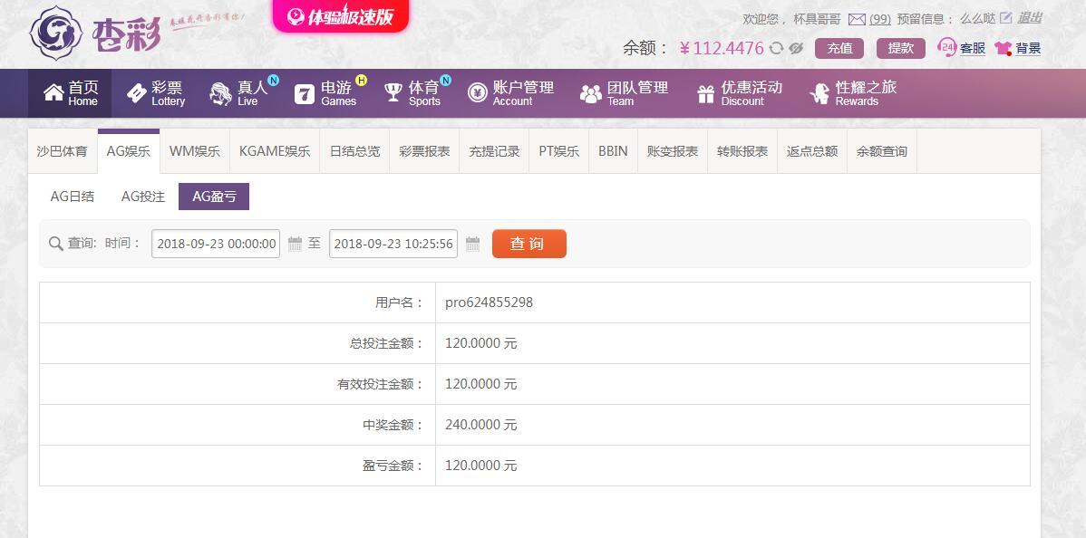 [|赢单奖励] 9月23日杏彩AG赢利100 |