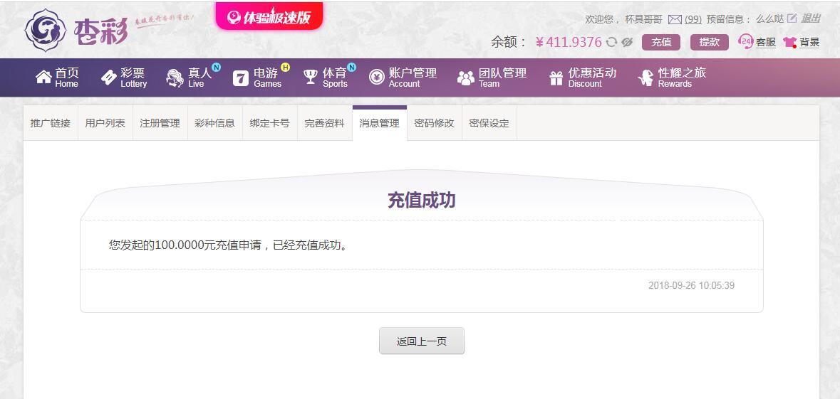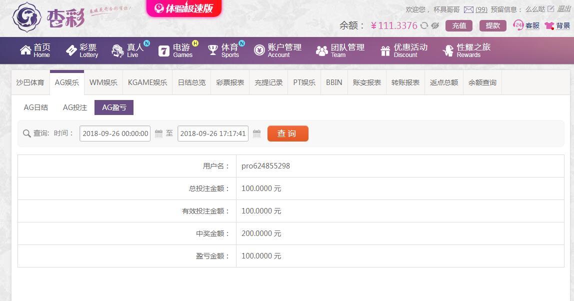 [|赢单奖励] 9月26日杏彩AG赢利100 |
