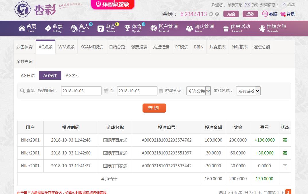 [|赢单奖励] 10月3日杏彩盈利1130元 |