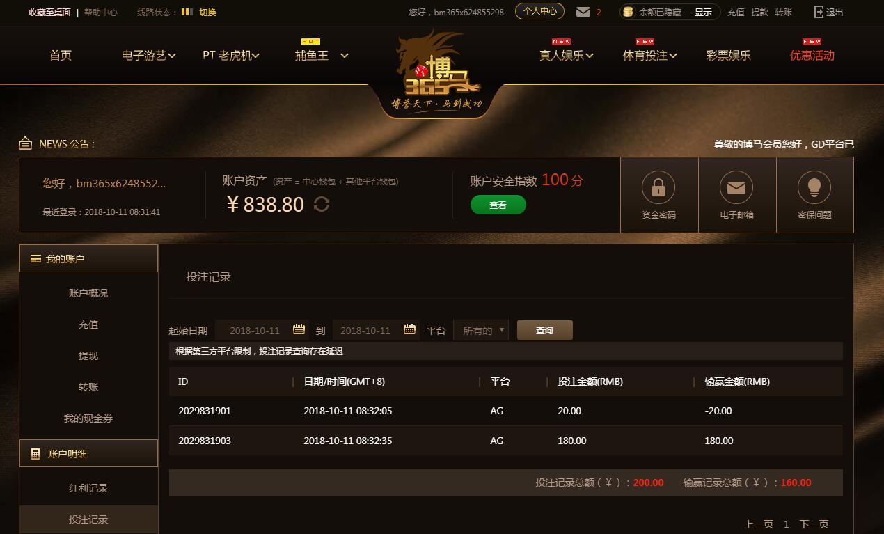 [|赢单奖励] 10月11日博马AG盈利120 |