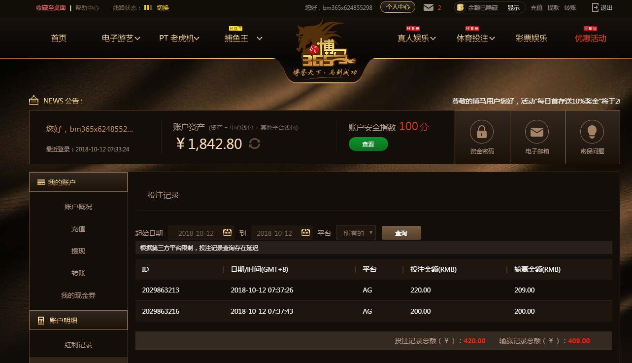 [|赢单奖励] 10月12日博马AG盈利400 |