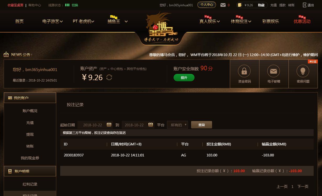 [|输单补偿] 10月22日博马亏损103元 |