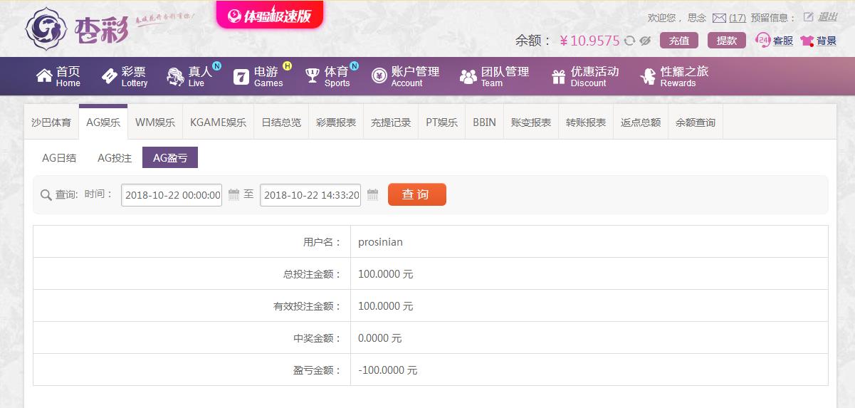 [|输单补偿] 10月22日杏彩亏损100 |