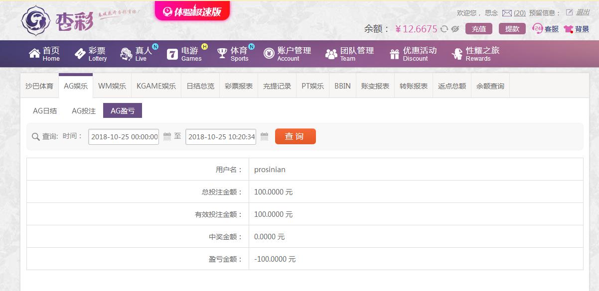 [|输单补偿] 10月25日杏彩亏损100元 |