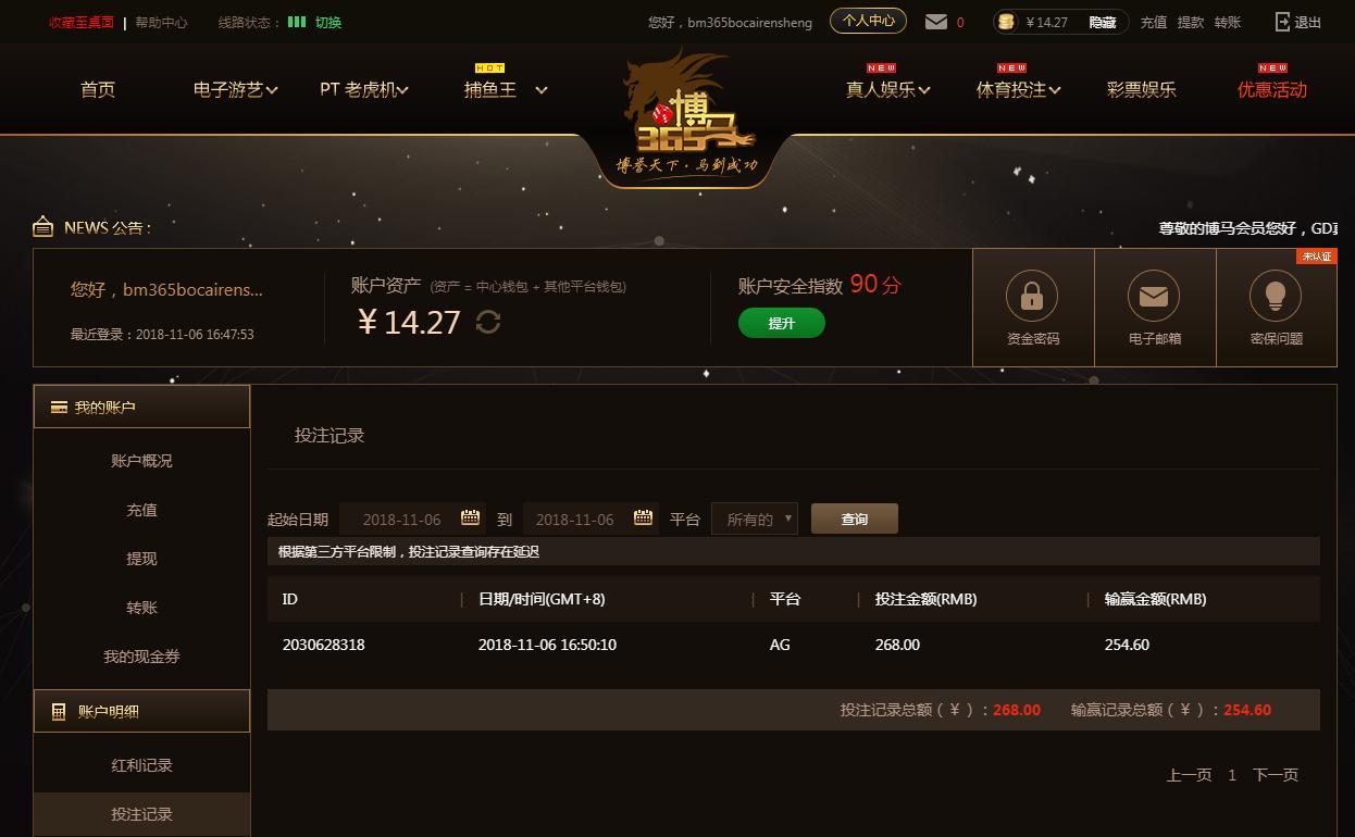 [|赢单奖励] 11月6日博马平台赢254元 |