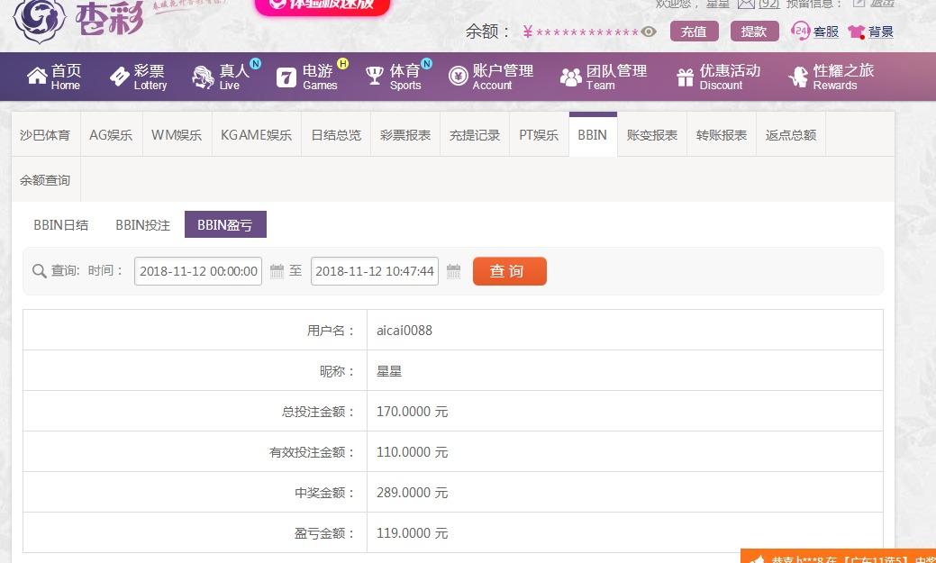[|赢单奖励] 11月12日杏彩盈利100 |
