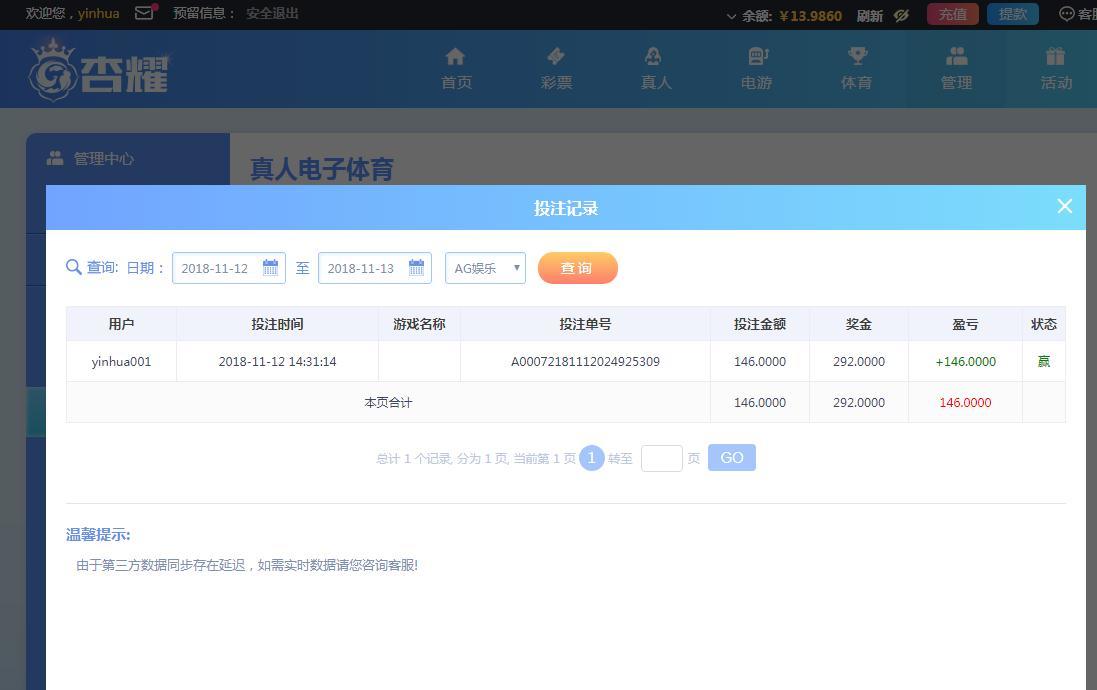 [|赢单奖励] 11月13日杏耀盈利146元 |