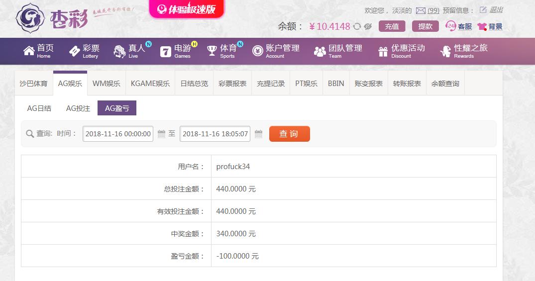 [|输单补偿] 11月16日杏彩亏损100元 |