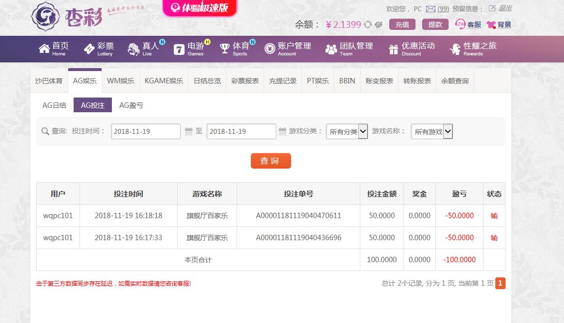[|输单补偿] 11月19日杏彩亏损100元 |