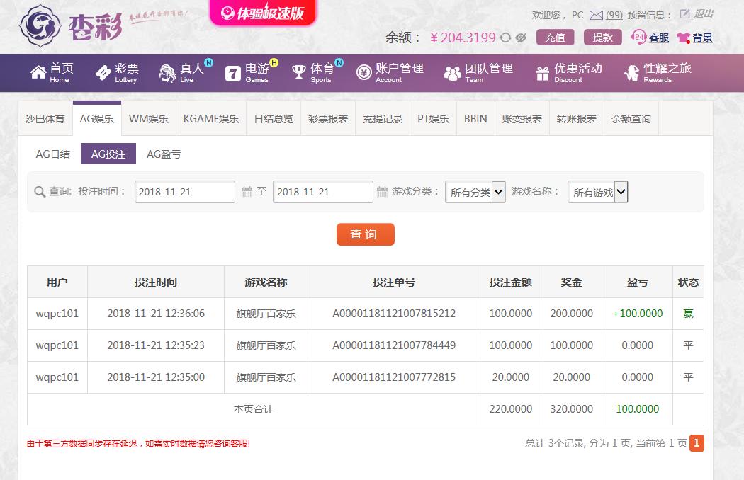 [|赢单奖励] 11月21日杏彩AG盈利100 |