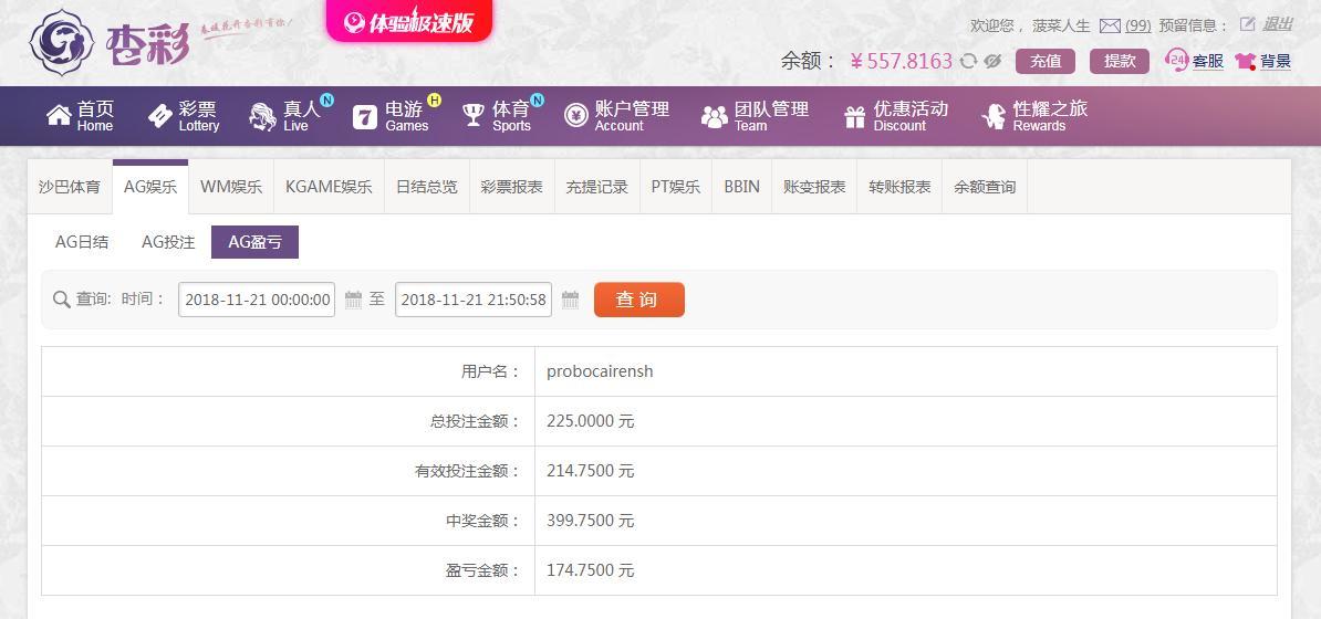 [|赢单奖励] 11月21日杏彩平台赢174元 |