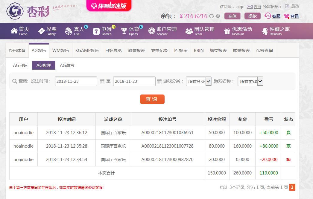 [|赢单奖励] 11月23日杏彩AG盈利110 |