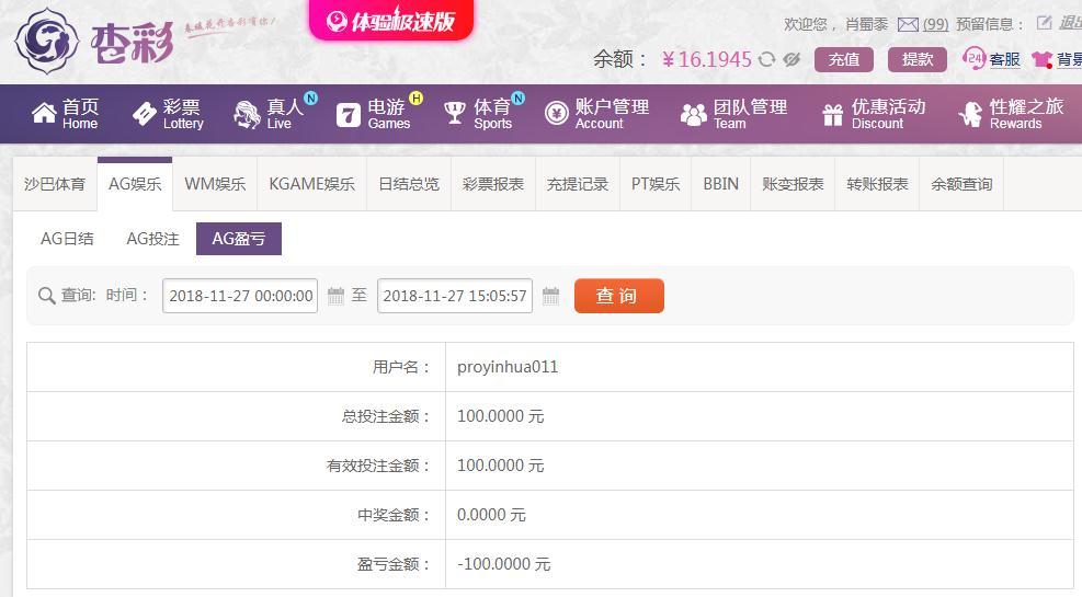 [|输单补偿] 11月27日杏彩亏损100元 |