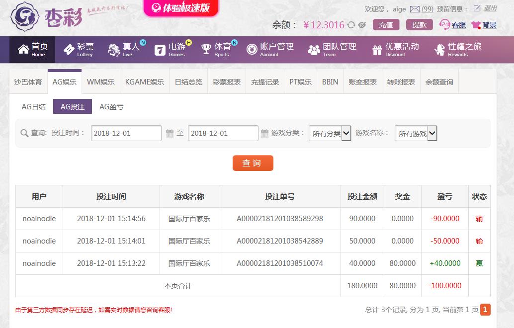 [|输单补偿] 12月1日杏彩亏损100 |