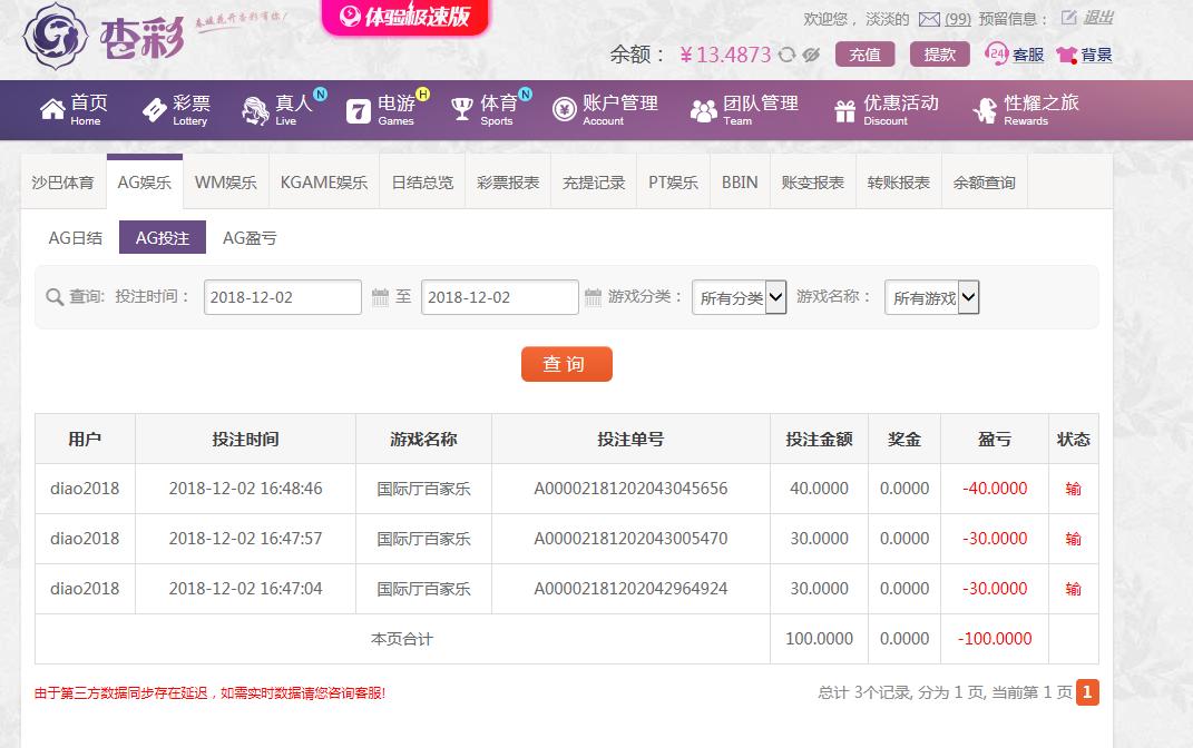 [|输单补偿] 12月2日杏彩亏损100元 |