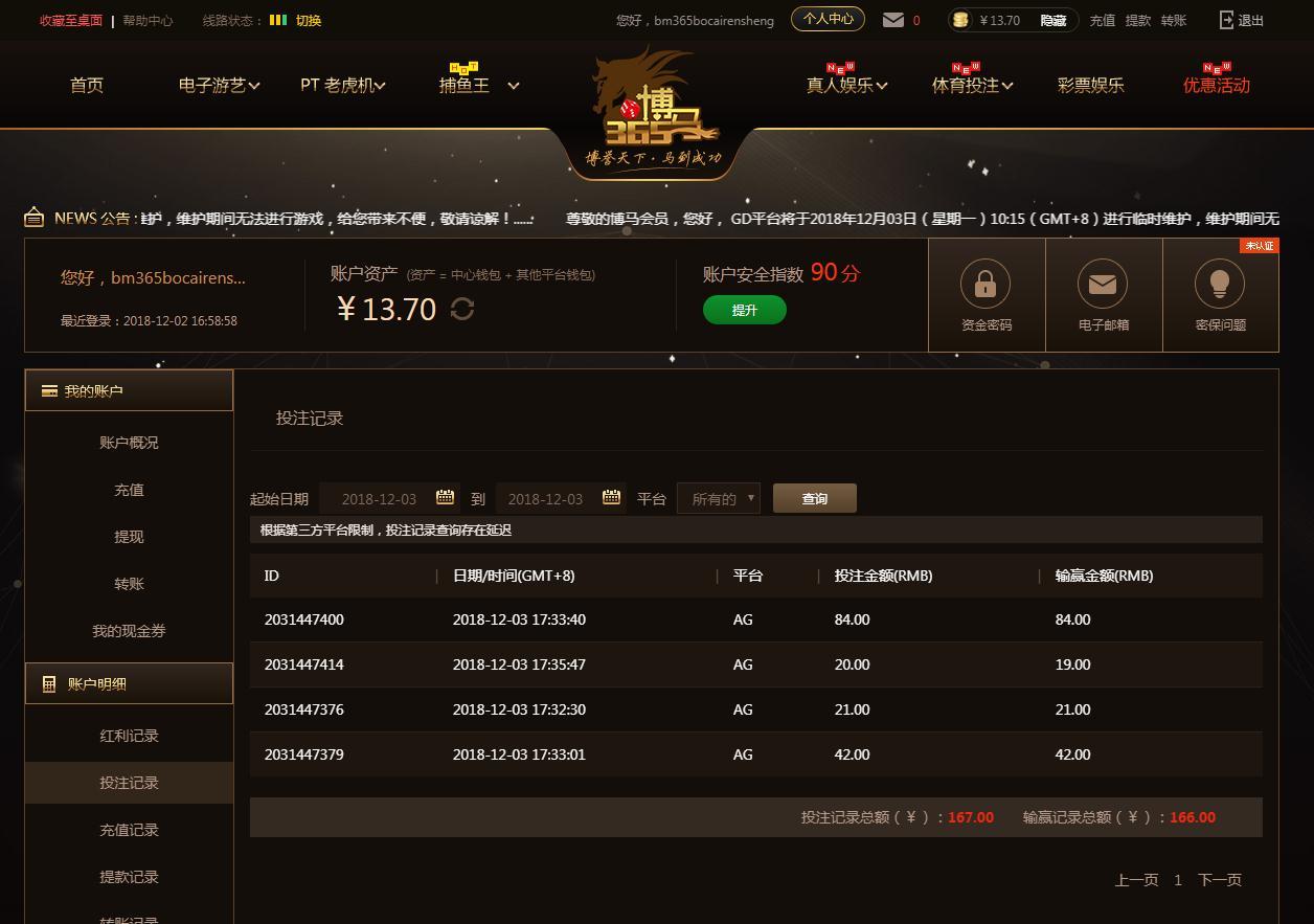 [|赢单奖励] 12月3日博马平台赢166元 |