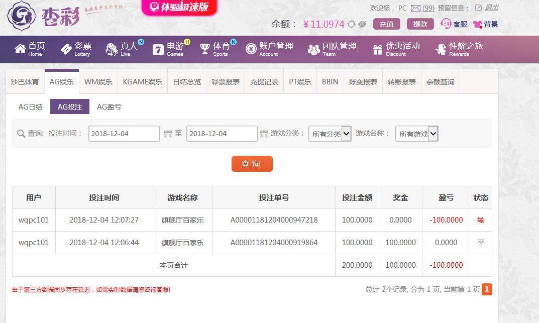 [|输单补偿] 12月4日杏彩亏损100 |