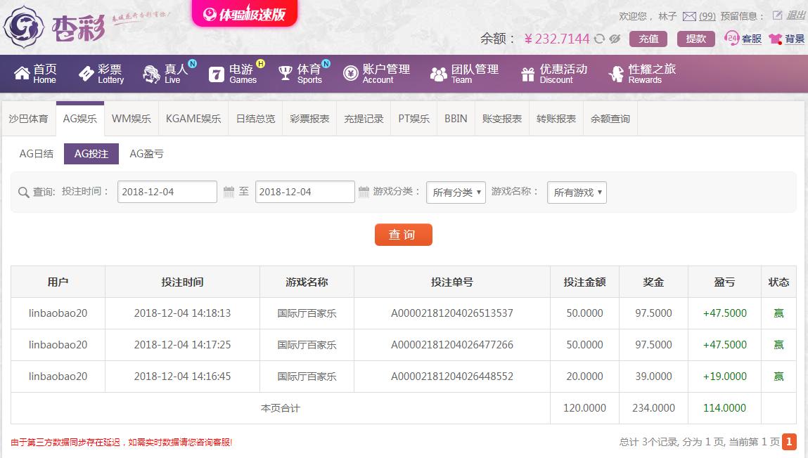 [|赢单奖励] 12月4日杏彩盈利114 |
