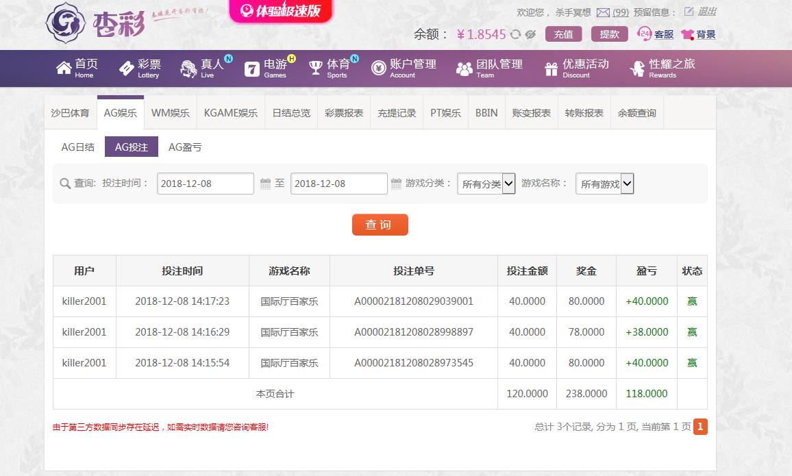 [|赢单奖励] 12月8日杏彩盈利118元 |