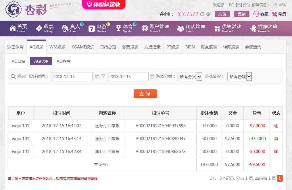 [|输单补偿] 12月15日杏彩亏损99.5 |