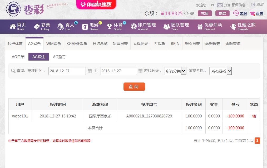 [|输单补偿] 12月27日杏彩亏损100元 |