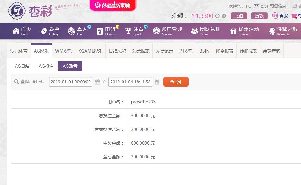 [|赢单奖励] 1月4日杏彩盈利300 |