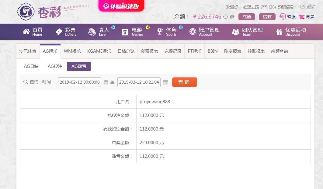 [|赢单奖励] 2月12日杏彩平台盈利112元 |