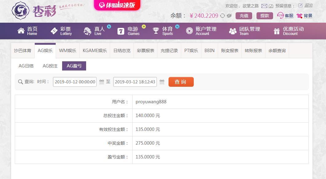 [|赢单奖励] 3月12日杏彩平台盈利135元 |