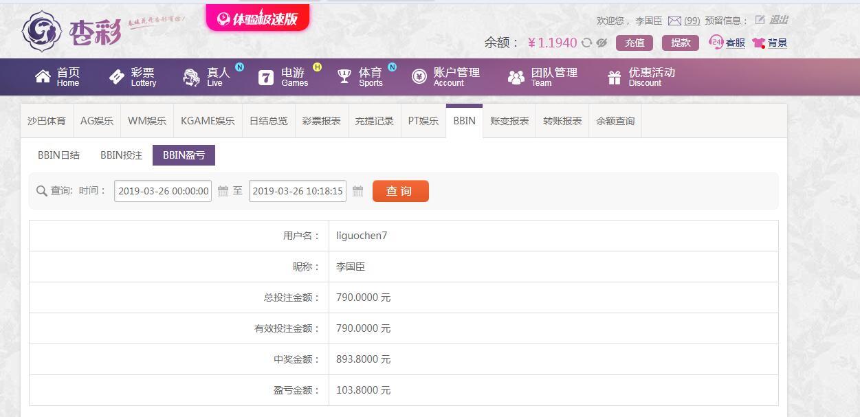 [|赢单奖励] 3月26日杏彩盈利103元 |