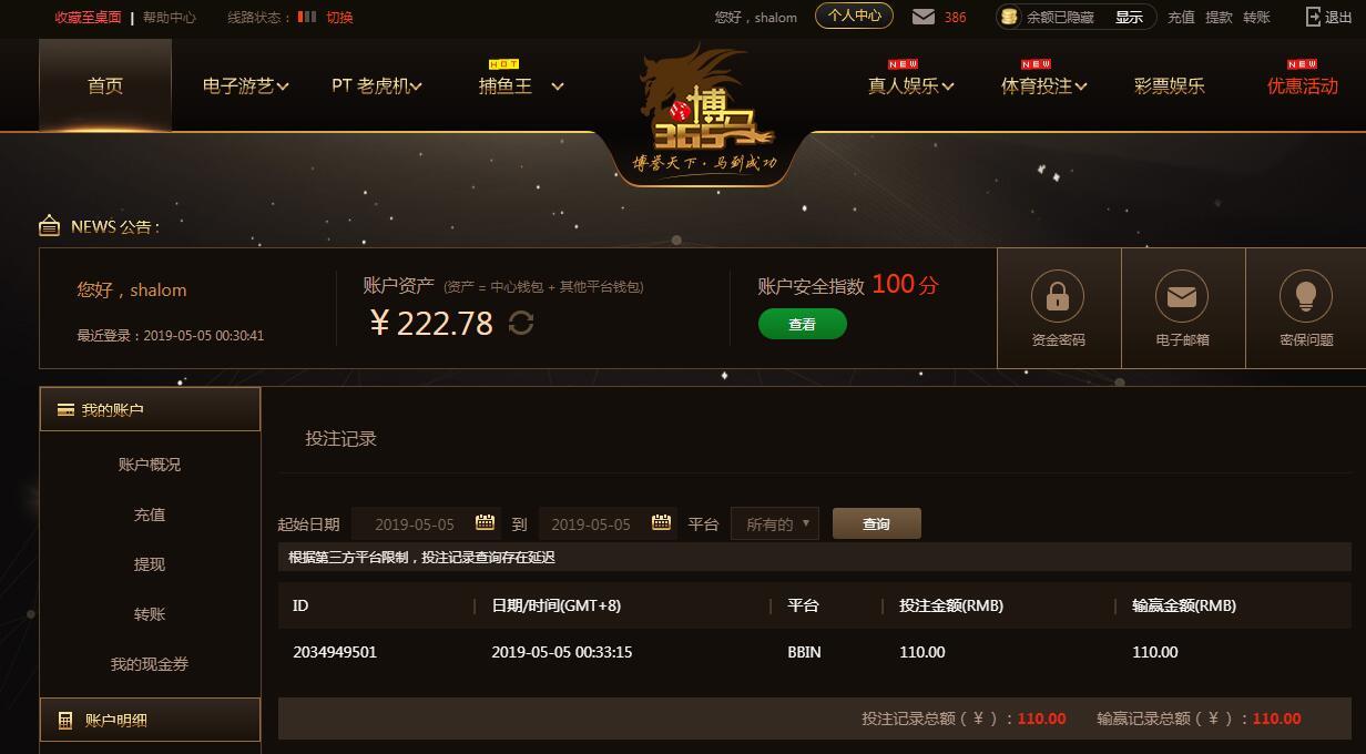 [|赢单奖励] 5月5日博马盈利110元 |