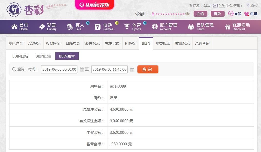 [|输单补偿] 6月3日杏彩亏损980元 |