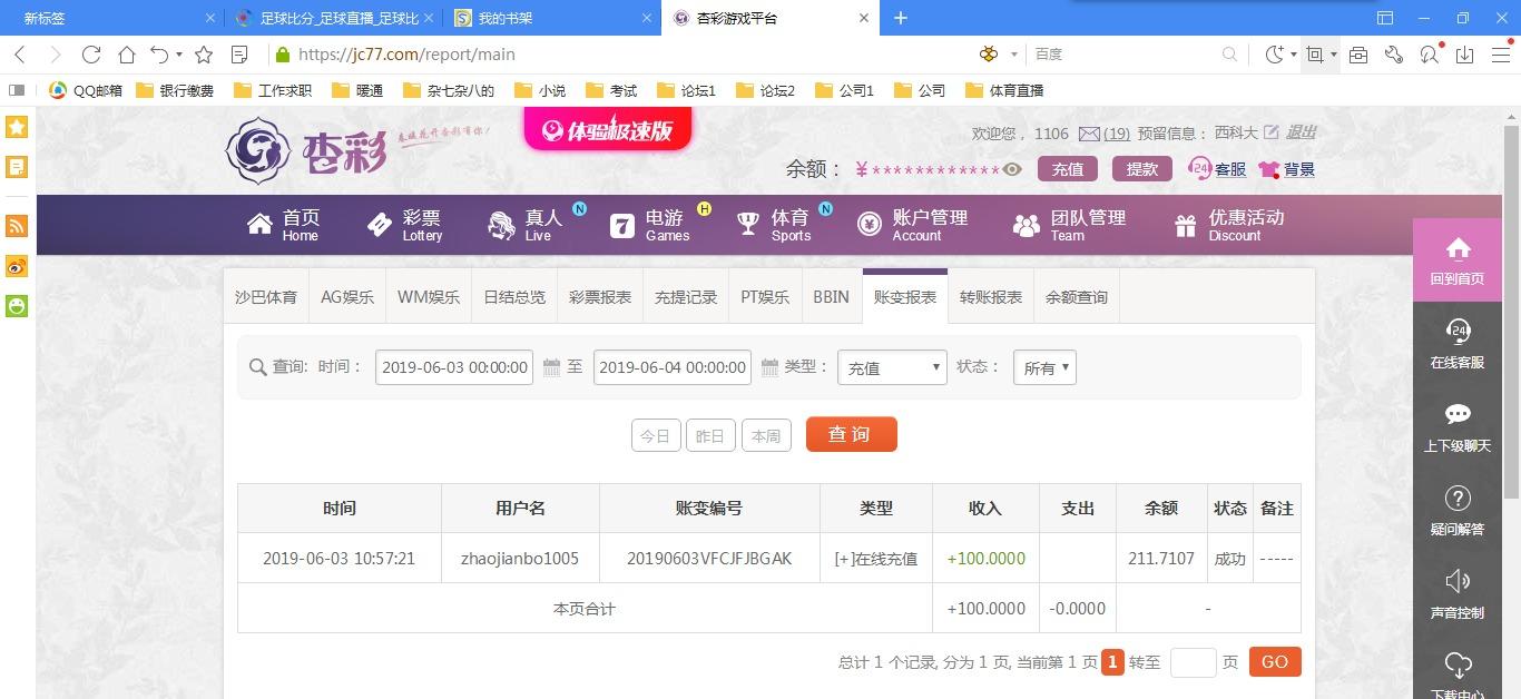 [|赢单奖励] 6.3杏彩真人盈利106元 |