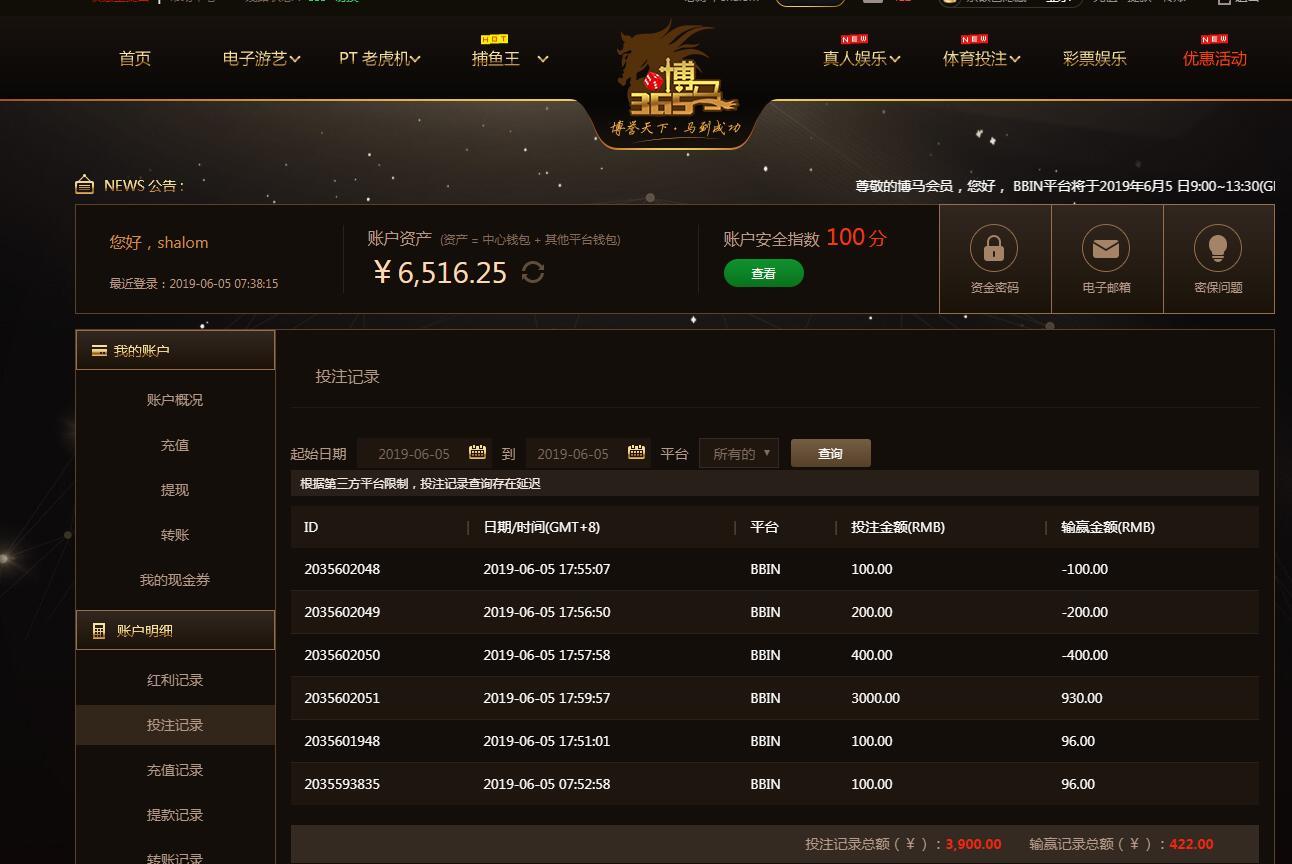 [|赢单奖励] 6月5日博马盈利442元 |