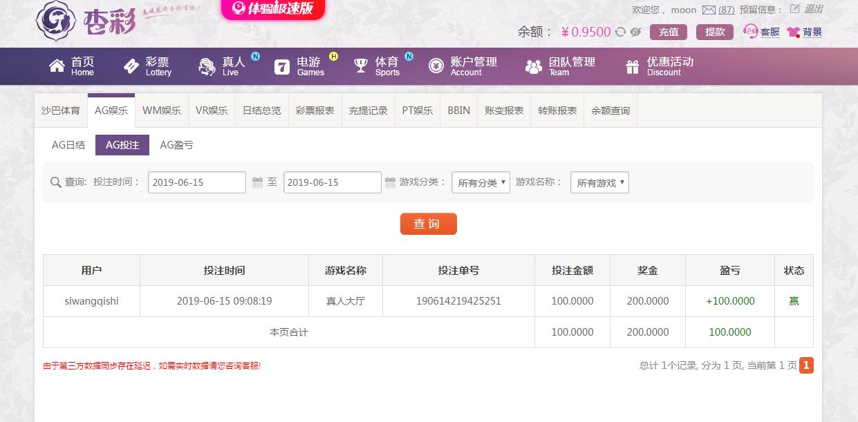 [|赢单奖励] 6月15日杏彩平台盈利100元 |
