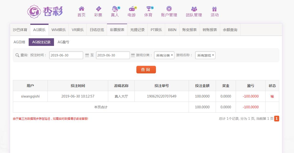 [|输单补偿] 6月30日杏彩平台亏损100元 |