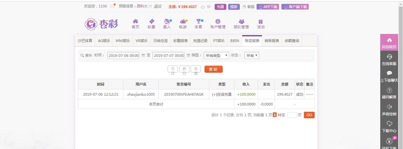 [|赢单奖励] 7月6日 杏彩真人盈利100元 |