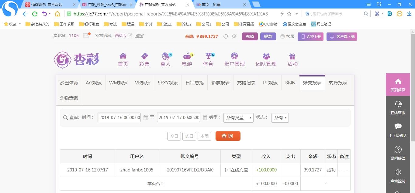 [|赢单奖励] 7月16日 杏彩真人盈利100元 |