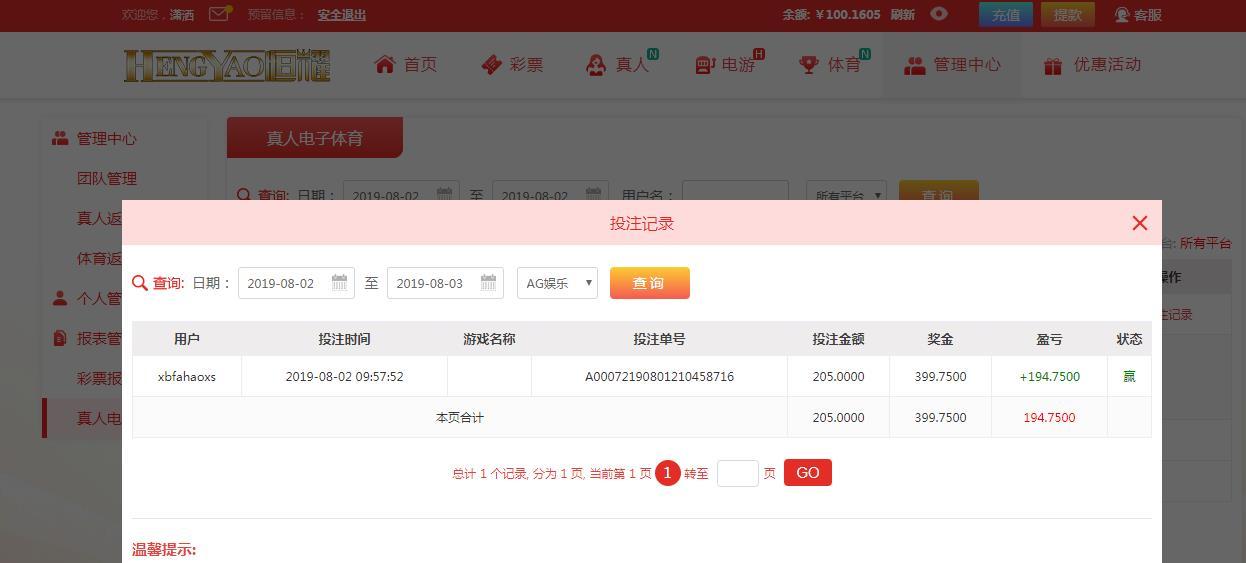 [|赢单奖励] 8月2日恒耀赢194元 |