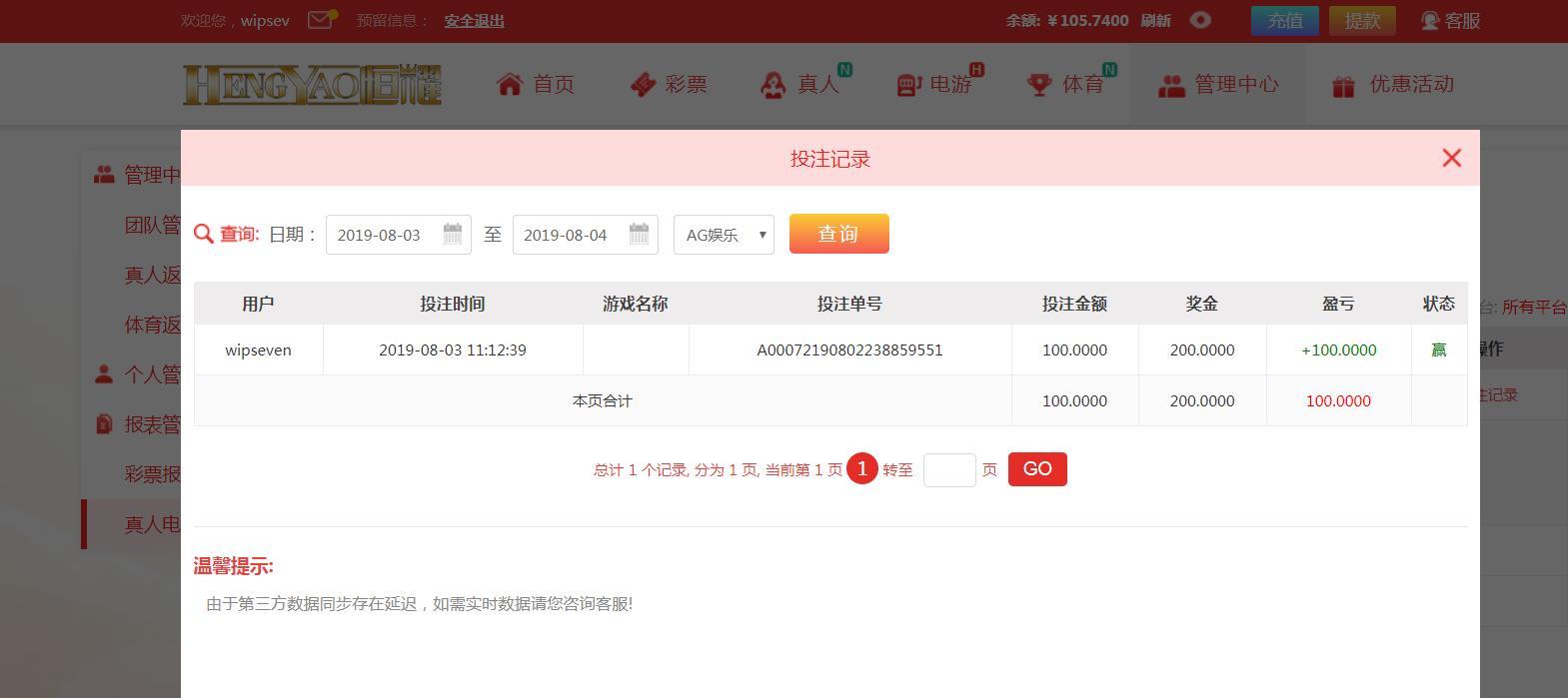 [|赢单奖励] 8月3日恒耀百家乐赢100元 |