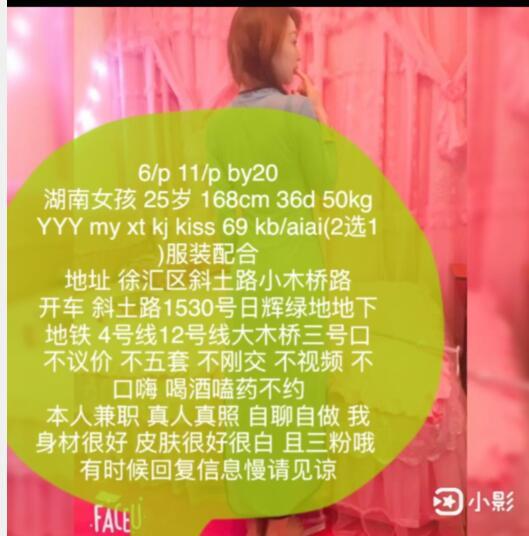 【寻欢细节】:徐家汇附近的老小区,时间有点长了,具体记不太清,那个时候我生活不太顺利,2个月找了9个妹子,夏采薇给我比较不舒服的体验 1,无YYY,基本指给你浴室厕所在哪里就进里屋了 2,服务基本都是敷衍了事 3,ML的时候拒绝女上,说我JJ太大,后入的时候又说怎么还不出来,弄疼她了 写这个妹子的原因她一直空间很活跃,希望大家知道情况 【附带照片】: