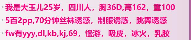 [xinxitop]提示信息[/xinxitop] 【寻欢时间】:2020年3月XX日 【寻欢地点】:上海普陀 【信息来源】:狼友推荐、论坛、亲身体验 【服务项目】:看图(可选,勿必填写真实服务项目) 【妹妹数量】: 【环境设备】: 【营业时间】: 【价格一览】:500/pp 【安全评估】:评分,满分100。 【服务星级】:★★★★★(最高5星)应适当评价质量 【重点推荐】: 【联系方式】:[unfree]qq:2111321546[/unfree] 【寻欢细节】:真人和照片60%-70%吧,优点:价格良心,服务好不催人(女上三式欲罢不能,舌尖上的享受)各位自己体验。缺点:地铁站下来走的我累死。 【附带照片】: