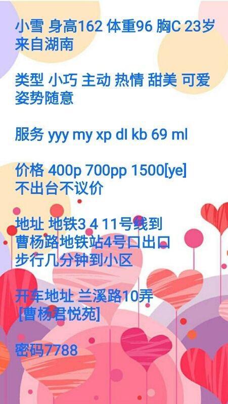 [xinxitop]提示信息[/xinxitop] 【寻欢时间】:2020年6月25日 【寻欢地点】:普陀(大概位置) 【信息来源】:狼友推荐、论坛、亲身体验 【服务项目】:鸳鸯浴,漫游,胸推,69式,冰火,口活,爱爱、SM(可选,勿必填写真实服务项目) 【妹妹数量】:1 【环境设备】:80 【营业时间】:下午 【价格一览】:400p 【安全评估】:评分,满分100。 【服务星级】:★★★★★(最高5星)应适当评价质量 【重点推荐】:最值得推荐的地方以供参考 【联系方式】:[unfree]love-juan20、qq:1707863343[/unfree] 【寻欢细节】:小雪应该很有名了,普陀那一片很多fl。除了身高矮了点,服务、价格,泻火一流 【附带照片】: