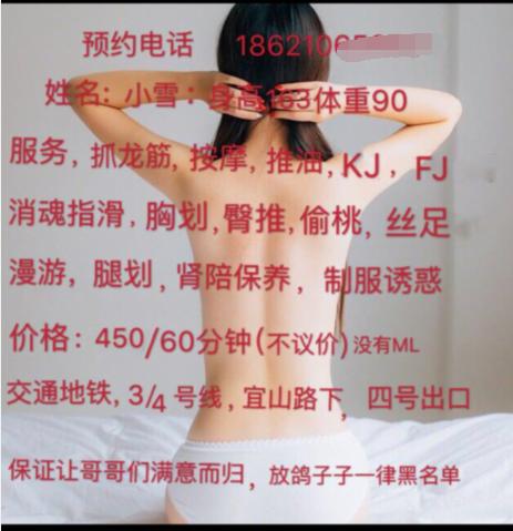 [xinxitop]提示信息[/xinxitop] 为了鼓励会员积极回复验证,只要原帖没聊天截图的,参与验证回复聊天截图都奖励100金币。 【寻欢时间】:2020 【寻欢地点】:徐汇区 【楼凤网名】:小雪 【信息来源】:论坛 【服务项目】: 【妹妹数量】:1 【环境设备】: 【营业时间】: 【价格一览】:400/60分钟 【安全评估】:评分,满分100。 【服务星级】:★★★ 【重点推荐】:最值得推荐的地方以供参考 【联系方式】:电话18621065653.qq2667962674